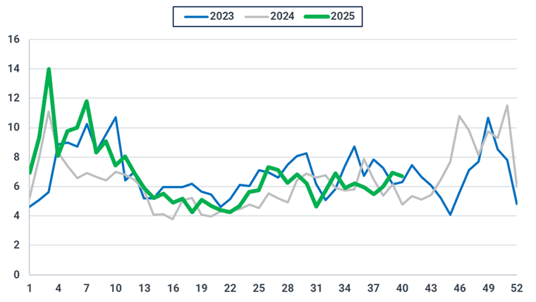 EU-27 underground gas stocks increased to 82.9% as of 8 September, 7.4% percentage points below the five-year average. Low temperatures caused two days of small net withdrawals during the week. Despite this, net injections were observed in the Netherlands, one of the laggard countries in terms of underground storage levels within the EU, mostly driven by a ramp-up in LNG imports.Recent Russian attacks on Ukrainian infrastructure have slightly increased injections into the Ukrainian grid, but no substantial increase in Slovakian flows has been noted so far (Hungarian and Polish flows are already at maximum capacity).