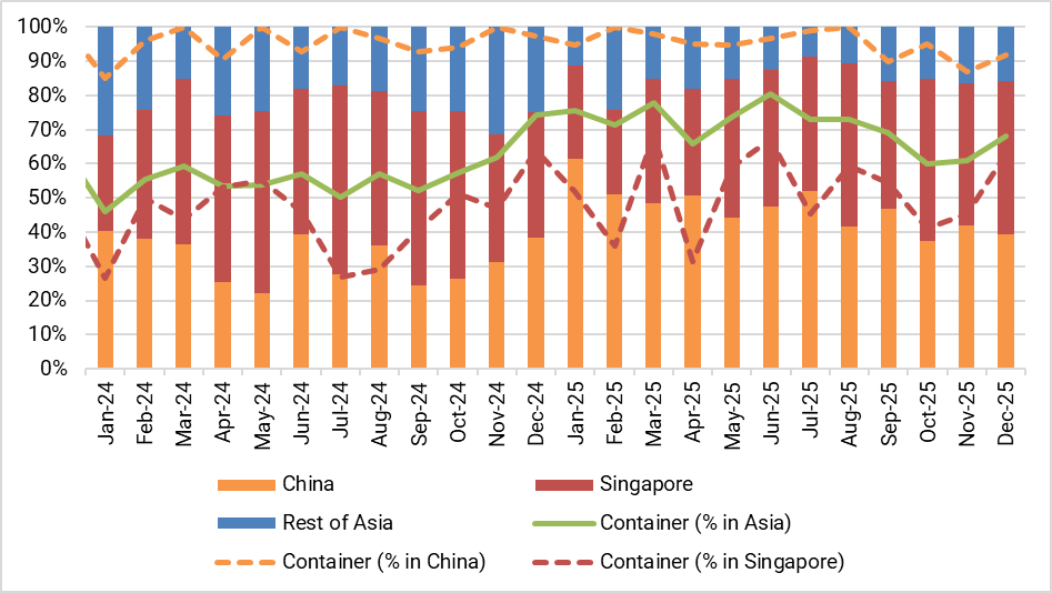 Conversely, structural constraints hampered momentum in other key hubs. Malaysia recorded a 39% year-on-year contraction following the conclusion of the Titan Vision charter in early 2025; while the Paolina Cosulich ramped up activity, it was unable to fully bridge the resulting capacity gap. Similarly, South Korea saw a 44% volume decline precipitated by a collapse in "gas-up and cooldown" activity, which stripped 19,000 t from the market. However, this masked a positive structural shift: KOGAS’ Blue Whale increased its operation count, signaling a pivot toward more frequent, consistent liner demand within the container segment.