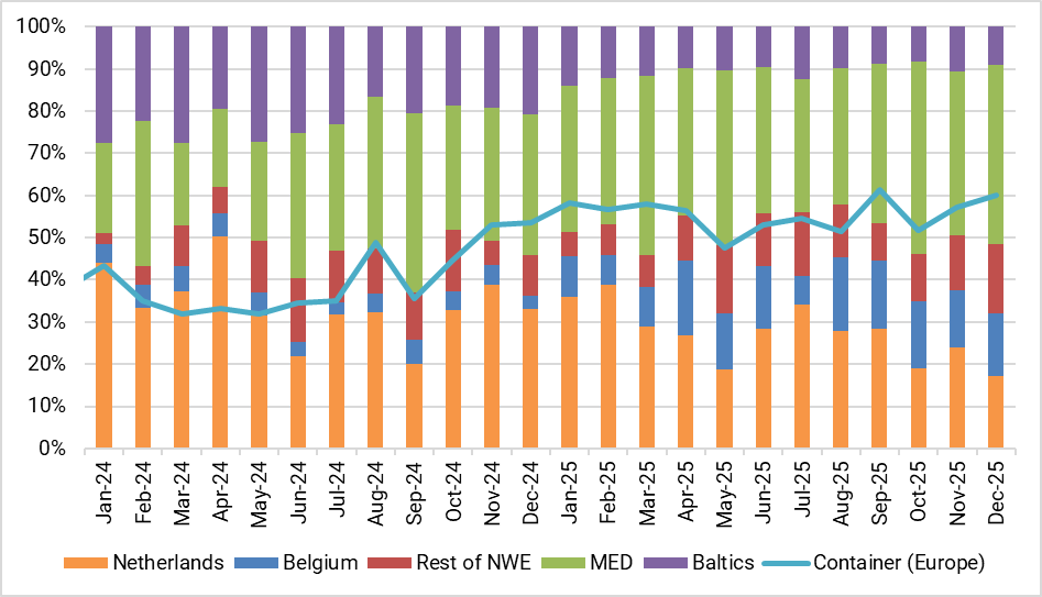 Europe’s sustained prime position stems from repeat consumption, deep fleet integration and more stable supply patterns. Northwest Europe (NWE) strengthened as the industrial backbone. Belgium emerged as a primary hub in 2025, particularly Antwerp, handling about 158,000 t, a 266% year-on-year increase, while Germany recorded steady growth of around 39%.