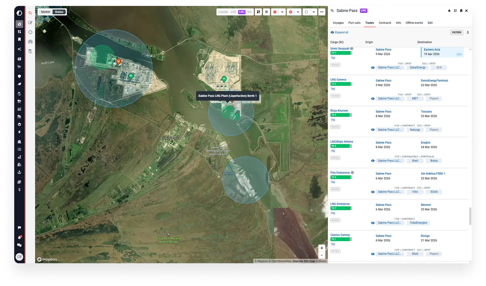 Monitor LNG cargoes with details like buyers, sellers, trade type, voyage details, including insight into diversions, tenders and LNG terminal outages.