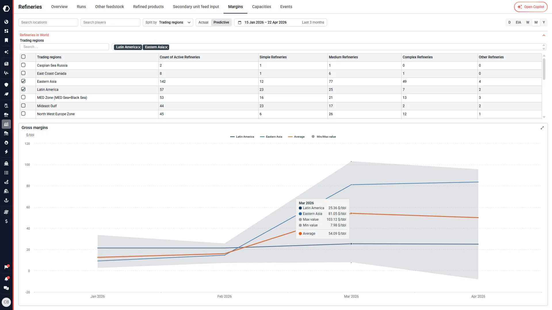 Evaluate publicly traded companies using Kpler’s detailed trade flow, crude quality, grade, refinery runs, production, and secondary unit input data mapped to publicly traded companies. Analyze crack margins, company performance, and operational efficiency in real time for actionable investment insights.