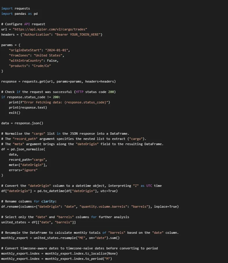 Kpler's APIs provide high-frequency trade flow, inventory, and supply-demand data that you can integrate directly into predictive models for statistical arbitrage, pairs trading, and correlation-based strategies. Rather than relying on delayed financial data, you access real-time signals of supply-demand imbalances, inventory shifts, and trade flows that often precede price movements. By combining these fundamental datasets with price forecasts for benchmarks like Brent and WTI, you can identify deviations from fair value and execute informed trades. The high-frequency nature of this data enables quant strategies that traditional fundamental analysis can't capture.