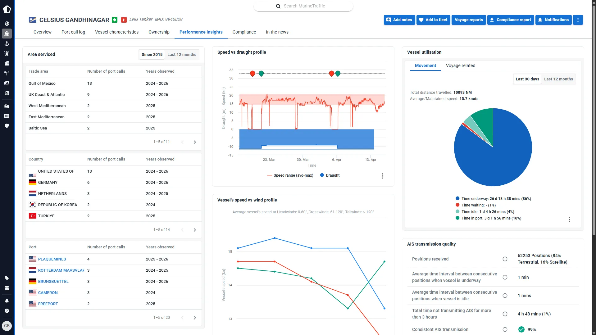 Kpler provides real-time vessel positions and movements, comprehensive route and performance history, port congestion analytics, and trade route density data—enabling brokers to quickly match suitable vessels with cargo and provide clients with confident recommendations. You can investigate vessel performance, track route compliance, identify weather or deviation risks, and assess market trends like port congestion and regional demand shifts. This intelligence allows you to spot emerging opportunities before competitors, advise clients on optimal timing and routes, and secure deals by being the broker who truly understands market conditions and vessel capabilities.