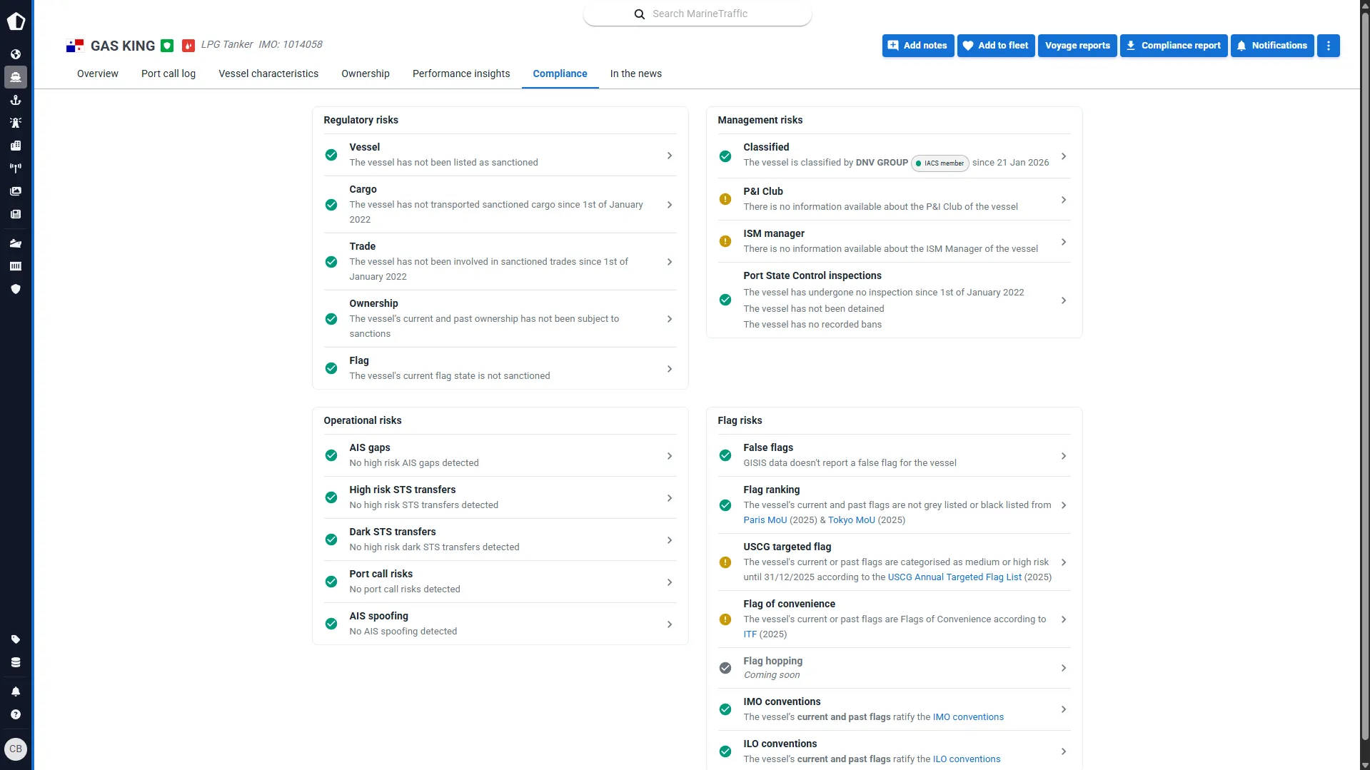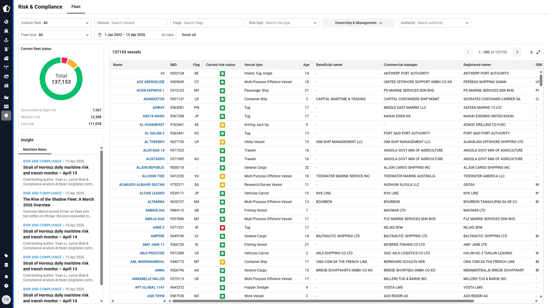 Screen vessels for operational, management and ownership risks to confirm compliance with sanctions and other regulations. Ensure you only have vessels on your books that meet your risk appetite, monitoring your fleet and taking immediate action if potentially suspicious activity takes place.