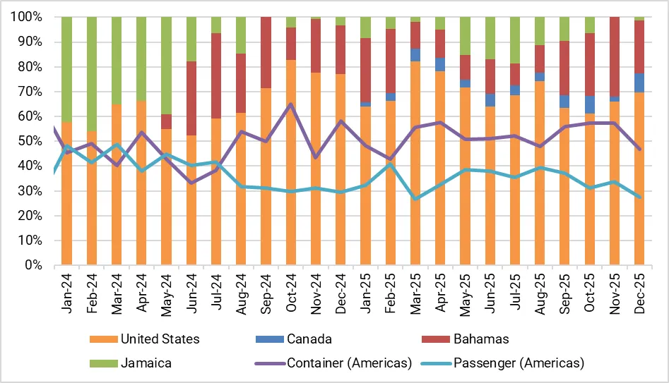 In contrast, Jamaica contracted by 17% to around 70,000 t, driven by redeployment of capacity as Shell’s New Frontier 2 reduced its local activity from 16 operations in 2024 to just four in 2025. While the Avenir Achievement ramped up container operations, it could not offset the wider volume exodus.